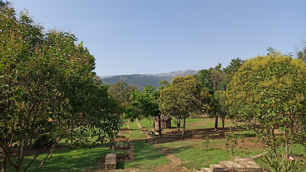 El exterior del centro es una zona de recreo ajardinada, delimitada con muros de piedra y vistas a la sierra de Gredos.