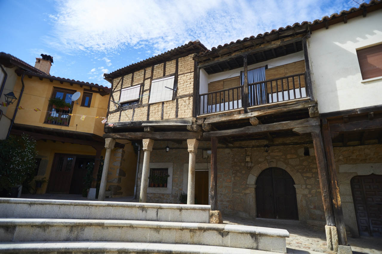 Las casas serranas, realizadas con mampostería, adobe y entramado de madera, cuentan con voladizos y fachadas porticadas sostenidas por columnas de madera sobre una base de granito.